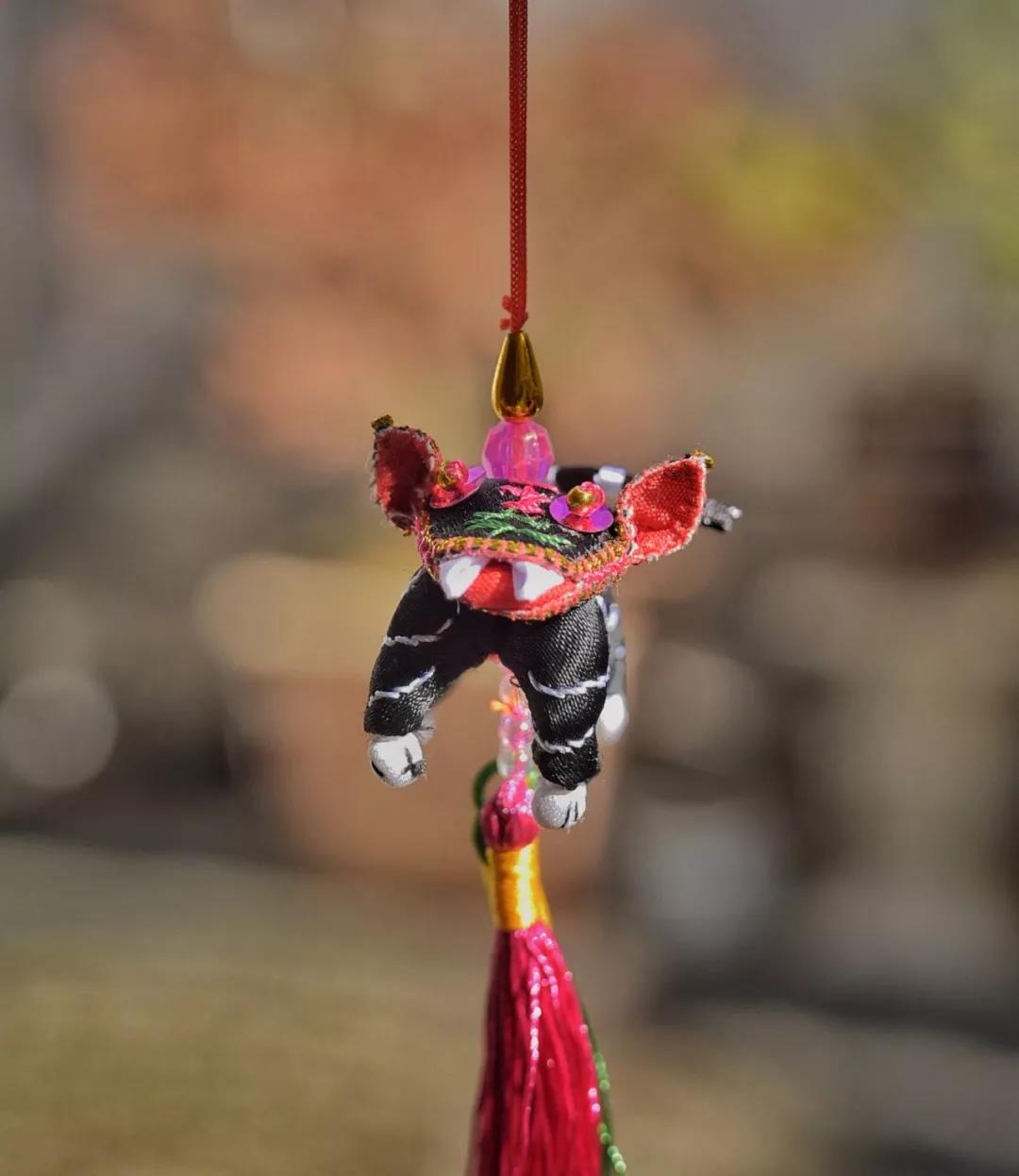 趙新妹通常都是把十多串的布扎(劍川的布扎按串來計(jì)算,一般將8個(gè)及其以上的配件穿成一串)放在一起賣。作品不僅花樣多、款式新,還可以根據(jù)喜好挑選獅子、繡球、老虎 、童子等不同小物件,十分討小孩子喜歡?!昂芏嗍烊硕际钦抑^來買,一般不到下午五點(diǎn),所有布扎便被搶購一空?!?
