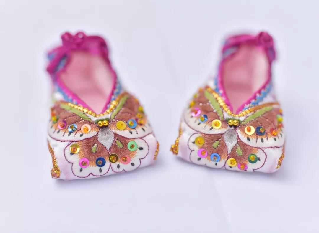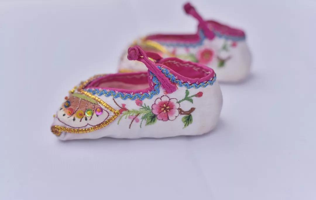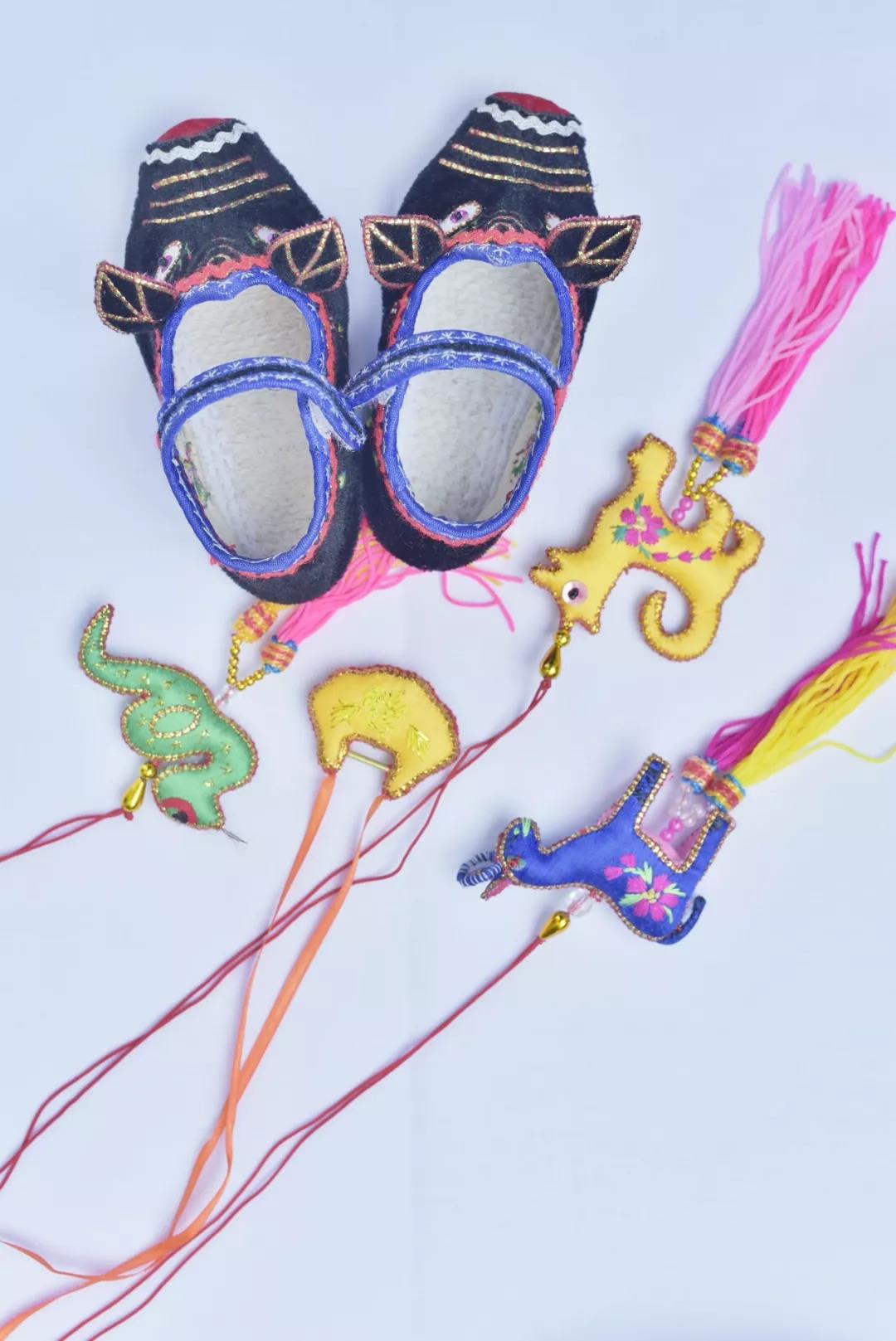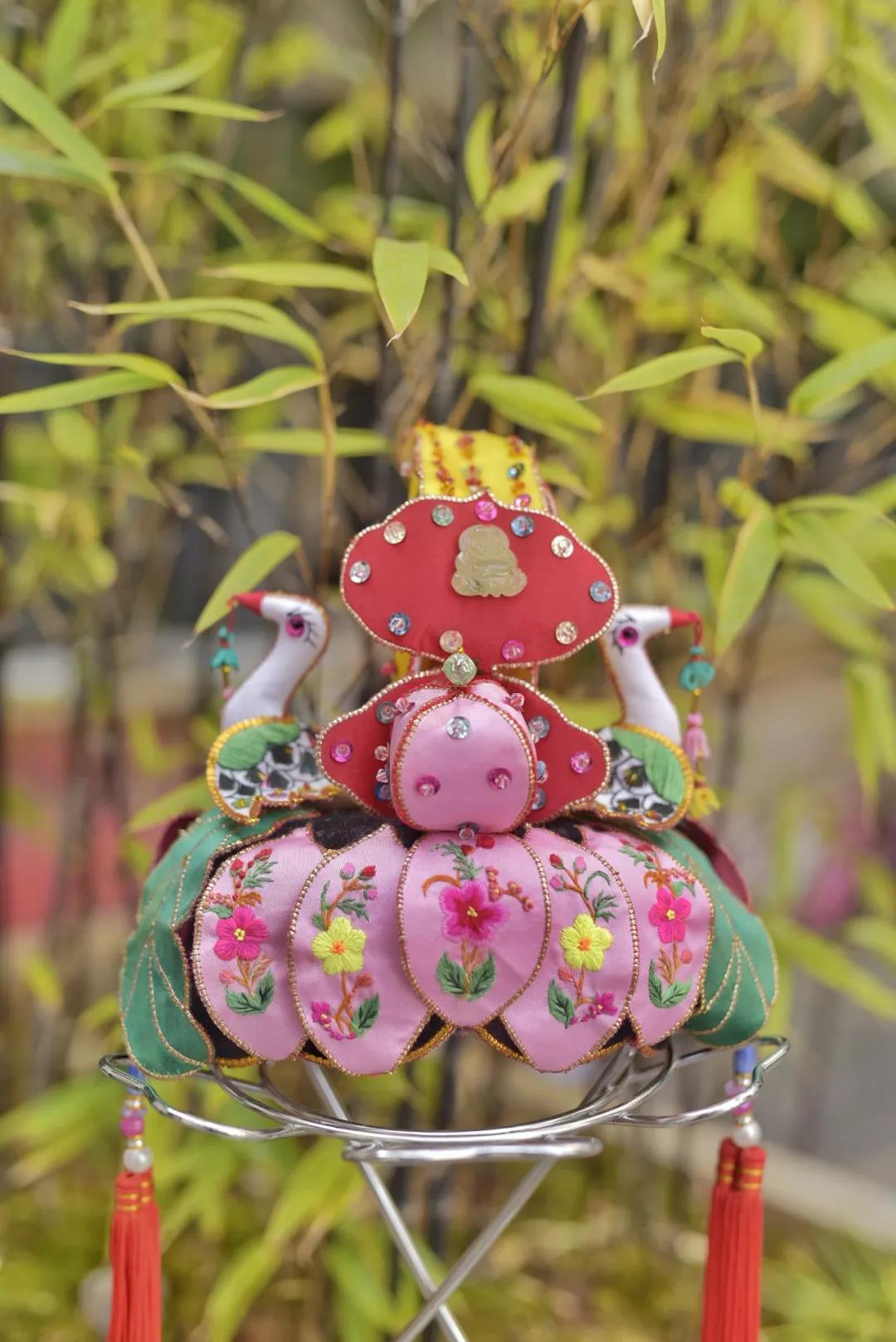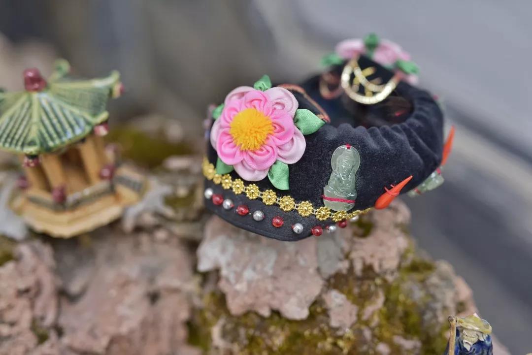 小有小的精妙,大有大的學(xué)問。除了小掛件精細(xì)別致,趙新妹做的大件帽子、嬰兒鞋也十分精美。純手工的布扎嬰兒帽將布扎與刺繡工藝結(jié)合,變換出蓮花、虎頭、狗頭等不同的形狀,再在帽子上裝飾諸如古玉、珠寶等配件,做工十分講究。趙新妹說,一頂帽子要用四五十天才能縫制好,用心程度可想而知。