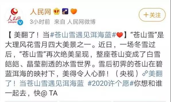 人民網(wǎng)的微博也讀懂了這一點,它說:“2020許個愿,當蒼山雪遇上洱海藍,你最想和誰一起去!”