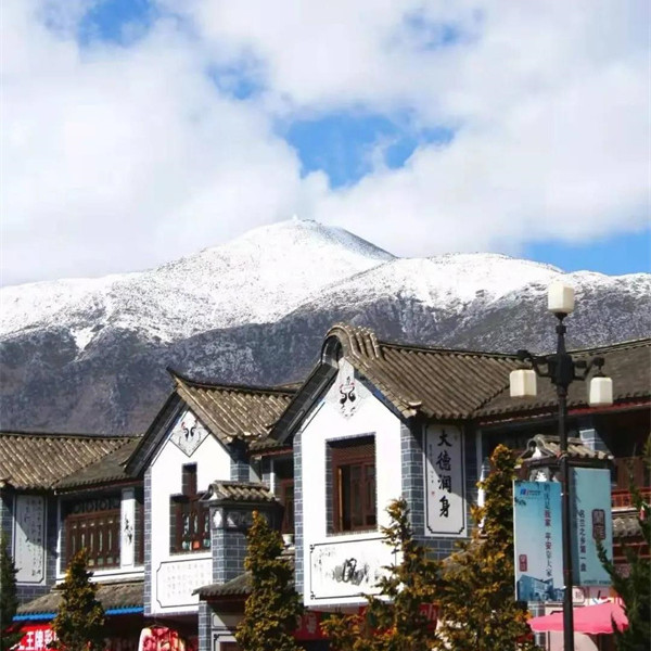 鶴慶 九鼎山純白色的積雪覆在山巔,從山下往上看,像是純色冰淇淋一樣誘人。積雪與小城交相輝映,雪山上的白與小城里白族民居的白墻竟是異常和諧!
