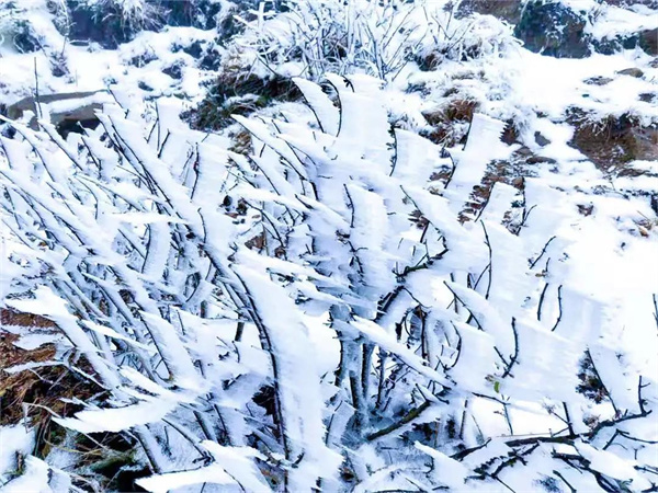 洱源羅平山是洱源縣境內(nèi)最高的山峰之一,四季風(fēng)光秀美?!按笱呵嗨桑嗨赏η抑??!倍绽?,羅平山上,雪花將山間染成純白色,樹葉上結(jié)滿了厚厚的冰晶,仿佛要把弱小的葉片壓彎,但它卻依舊保持著自己的形狀,不肯讓步半分!