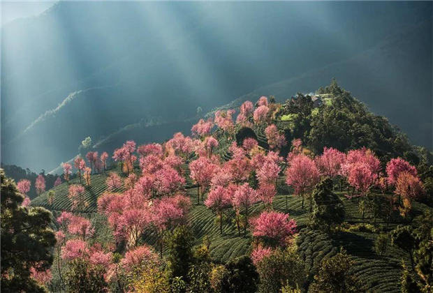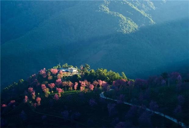 而這山也是極襯這花的。無量山雄奇又不失溫潤(rùn)秀麗,絲絲縷縷的霧氣不時(shí)自山麓間飄來,綿延的茶樹在冬日依舊綠意盎然。千山一碧、云飄霧繞,無量山宛若一塊巨大的臺(tái)幕,盡心襯托著冬櫻的光芒四射。