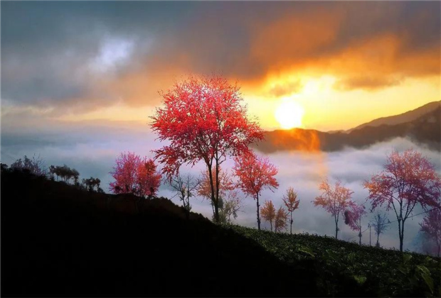 正值呵氣成霜的季節(jié),其它地方早已葉落歸根,滿目枯藤,可無量山櫻花谷中的冬櫻卻無視料峭寒風(fēng),開了個(gè)滿山櫻紅,遙遙望去,仿若霞光從天垂落,熠熠生輝。
