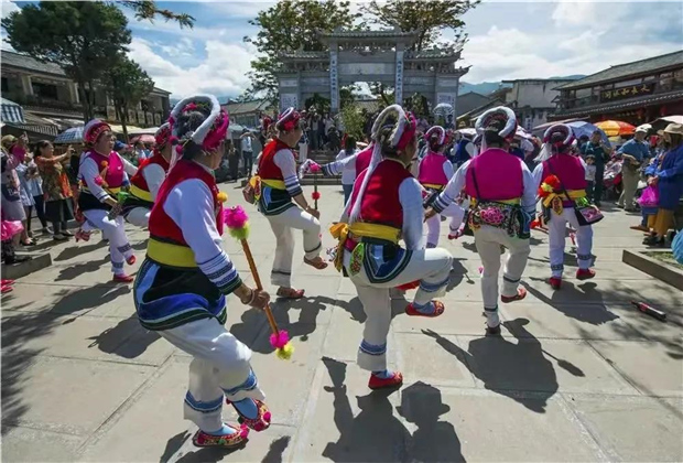 詩歌是有韻律的文字,舞蹈是有節(jié)拍的步調(diào)。而民族舞蹈的形成包含諸多因素,性格開朗且好客的白族先民們崇尚農(nóng)耕,樂習詩文,正是由于這樣的風土人情,白族霸王鞭這種熱情獨特的舞蹈孕育而生,在“繞三靈”“鬧春節(jié)正月”“田家樂”等民俗節(jié)慶活動和建房嫁娶等習俗中廣泛存在。