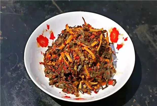 有人概括賓川所謂的“十八怪”,其中有“出外愛帶酸腌菜”這一“怪”。韭菜腌菜是賓川獨有的特產(chǎn),色澤金黃,聞著刺鼻,吃著爽口,可以單獨食用,也可作為炒菜中的輔料,特別適合炒肉和煮魚。
