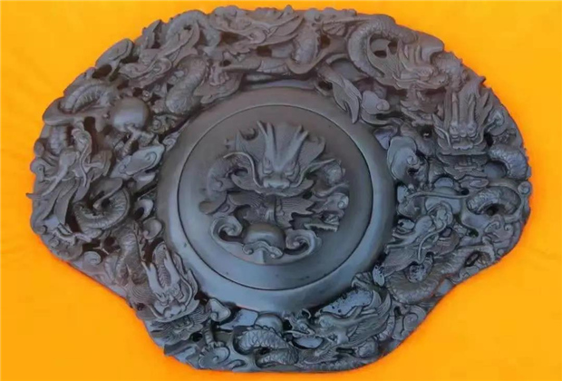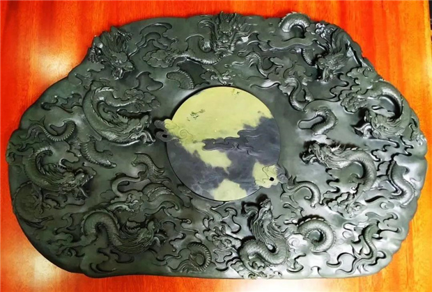 此硯選用上乘鳳羽硯石,經(jīng)六個月純手工精雕細(xì)琢而成,硯臺上雕飾九條龍,其形態(tài)各異,神采飛揚(yáng),中間硯堂蓋子用帶黃彩的硯石雕刻一輪初升的朝陽。該硯布局合理,雕工精細(xì),象征中華民族崛起騰飛,蒸蒸日上的和諧盛世景象。