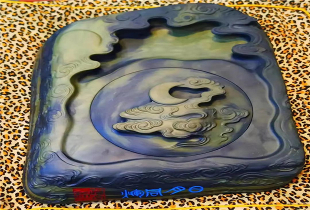 此硯用珍貴稀有的鳳羽硯石精雕細(xì)琢而成,此石色彩豐富,青綠黑三色相間相暈組成,綠中帶青,青中有黑。其造型是一棵青白菜,葉子翻卷自然,上飾一只蟈蟈,整硯形態(tài)逼真生動,有“清白”“祥和”之寓意,是一方有極高收藏價值的鳳羽硯臺珍品。