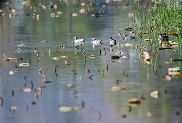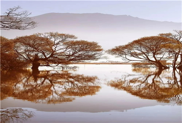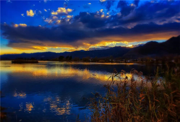 高原淡水湖泊草海濕地,位于鶴慶壩子中間。草海水域通過小溪溝渠、田疇與漾弓江相連,河渠縱橫,木舟往來?!奥湎寂c孤鶩齊飛,秋水共長天一色?!苯鹎飼r(shí)節(jié),草海濕地色彩斑斕,美如詩畫。