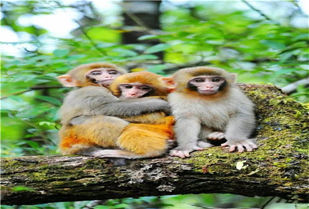 天空逐漸放晴,閑云悠悠,滿眼蒼黛,寂靜山林中,猴群自在地撒著歡兒。