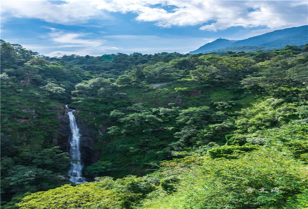 這是雞足山的玉龍瀑布,又稱大龍湫,其源自天柱峰金頂寺下海拔3100多米的龍王泉,流經(jīng)仰高峽,納滴雪崖、兜率庵石洞和真武洞三泉成三獻(xiàn)水,穿林破霧,奔流而下,到達(dá)落差60米的滴水崖,界破青山,而后形成,是雞足山著名的八景之一即飛瀑穿云。