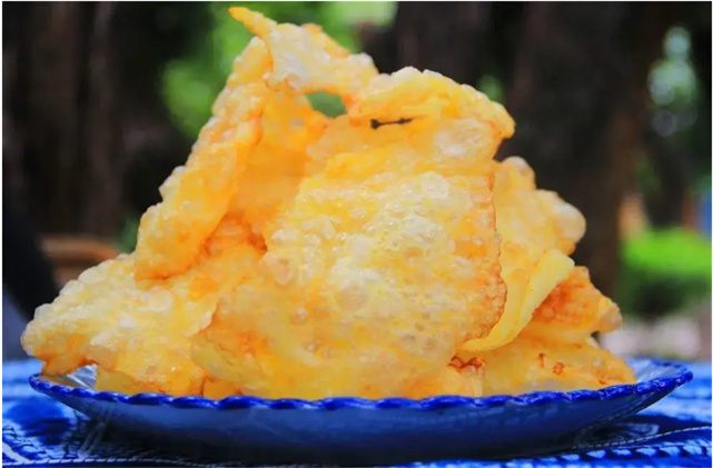 油炸乳扇是大理白族人家最常見(jiàn)的吃法,擺宴設(shè)席通常都有油炸乳扇這道小吃。