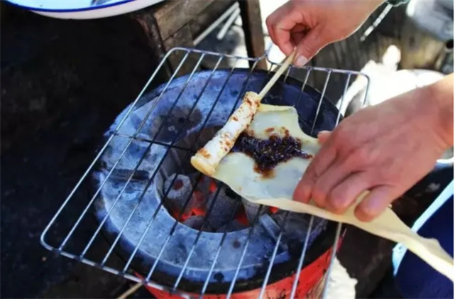烤的過(guò)程中將乳扇平鋪成塊狀,用木棍掛住被烤軟的部分,依口味涂上煉乳或者玫瑰醬,邊卷邊烤,最后卷成筒狀??竞玫娜樯瘸脽嵋弦豢?,口感像軟軟的芝士,稍冷卻后的烤乳扇嚼起來(lái)多了幾分韌勁,奶的清香與玫瑰醬的清甜在舌尖上碰撞,耐人尋味。