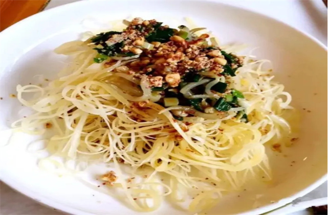 涼拌乳扇絲:乳扇切細(xì)絲,配上熱水焯過(guò)的韭菜,淋入各種作料,微酸的奶香撲鼻,為之陶醉。炒乳絲柔中有韌,潤(rùn)滑鮮香,咸辣適當(dāng)。