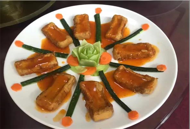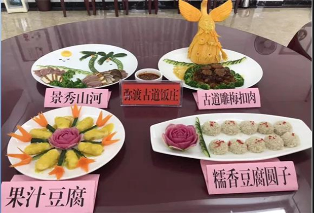 古道飯莊以白豆腐、臭豆腐作為原材料,經(jīng)過不同的烹飪方法及多種多樣的造型設計,推出了瓦片豆腐、鐵板豆腐、開心豆腐、脆皮豆腐、鍋塌豆腐、果汁豆腐等多種菜品,讓一道道豆腐菜迸發(fā)出全新的味道。