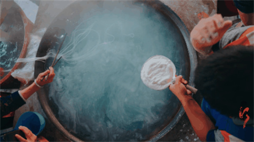 一家人齊上陣,默契的構建了一條流水線。兩翁婿打頭陣,把粉團放在特制的漏勺上,利用手背的力量不停擊打,淀粉則順勢而下,到熱水里定型為絲狀。