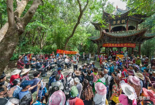 “蝴蝶泉邊·蝴蝶會(huì)”期間,在蝴蝶泉邊、情人湖邊、竹林道等位置,由景區(qū)舞蹈演員帶領(lǐng)游客朋友一同開展歡歌打
