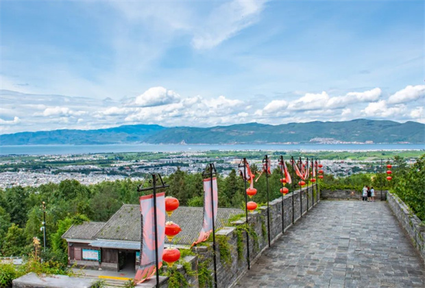 黝黑的墻垛圍了一個(gè)巨大的空地,站在空地遠(yuǎn)眺最開闊的地方,平整的原野中建筑混合著農(nóng)田分布,在圓潤(rùn)的山峰和原野之間是一片平靜的水面,它們就是大理的古城和洱海。