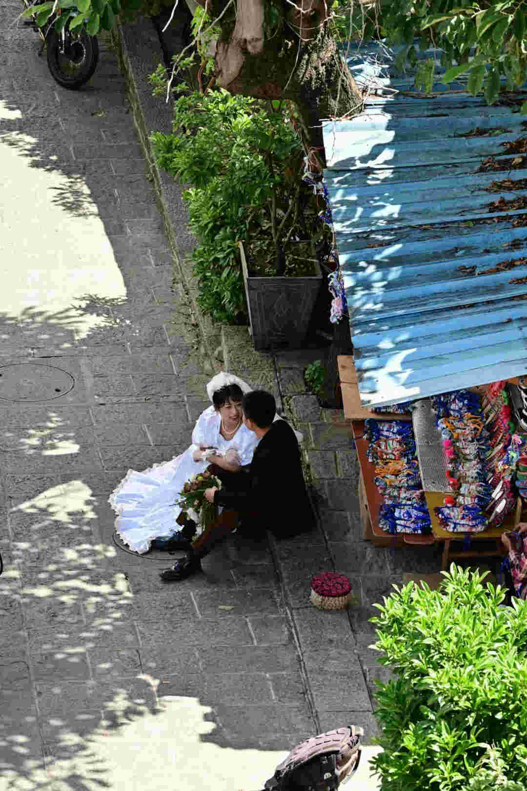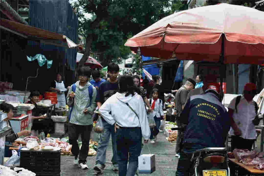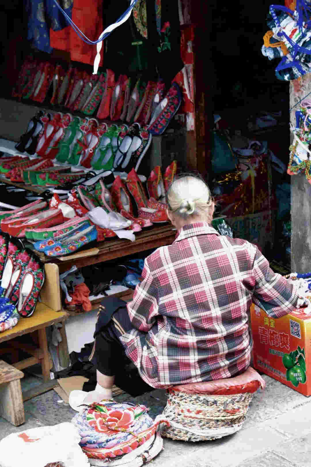 嬢嬢自己手作的米糕熱氣騰騰,蒸起誘人清香。路邊的柿子圓潤飽滿,在竹籃里被擺得整整齊齊,阿嬢說,這是她自家的柿子樹結(jié)的果子。一棟棟有年代感的陳舊老民居前,是一個又一個最簡單接地氣的攤販。白族阿姐一面趁著明媚陽光刺繡,一面照看著自家的醬料攤。老人縫著繡花鞋,花團(tuán)錦簇中,絲絲縷縷繞不開一代人的生活與情懷。