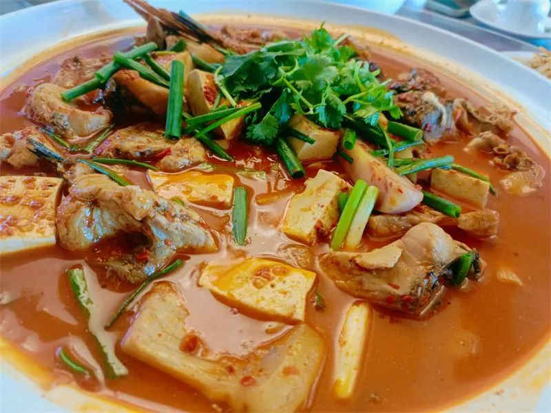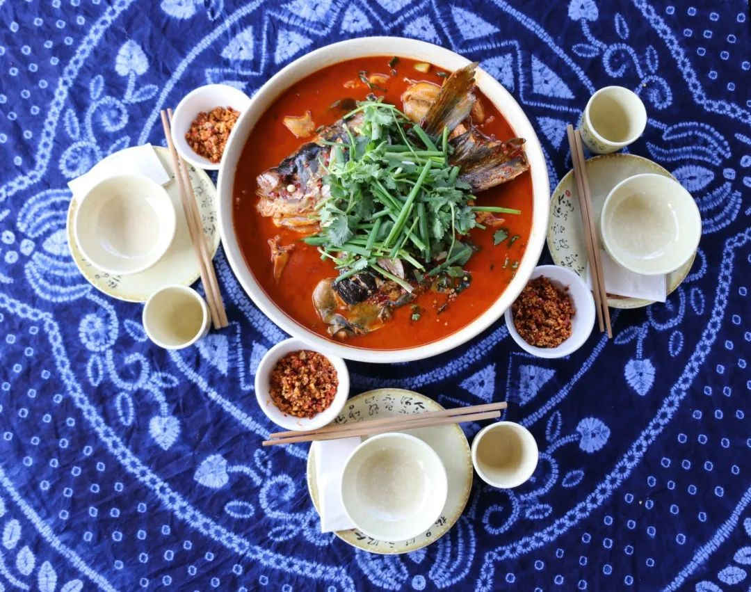 “家財萬貫不如魚湯泡飯?!痹诖罄恚瑤缀跫壹視鏊崂濒~,其味美鮮香、酸辣可口、百嘗不厭,一直以來都是白族家宴上的主角以及待客的“招牌”。大理酸辣魚以洱海鯽魚為主材,配以紅椒、青椒、木瓜、楊梅或烏梅為原料,用土灶燒柴火煮成,有時還會放入土豆和豆腐作為輔料,酸、辣、鮮、香,令人食欲大開。嘗上一口,鮮甜甘美,鮮香的魚湯用來泡飯,更是美得從胃到心里。