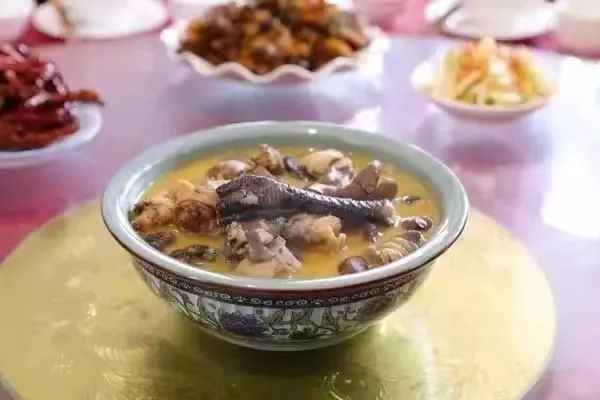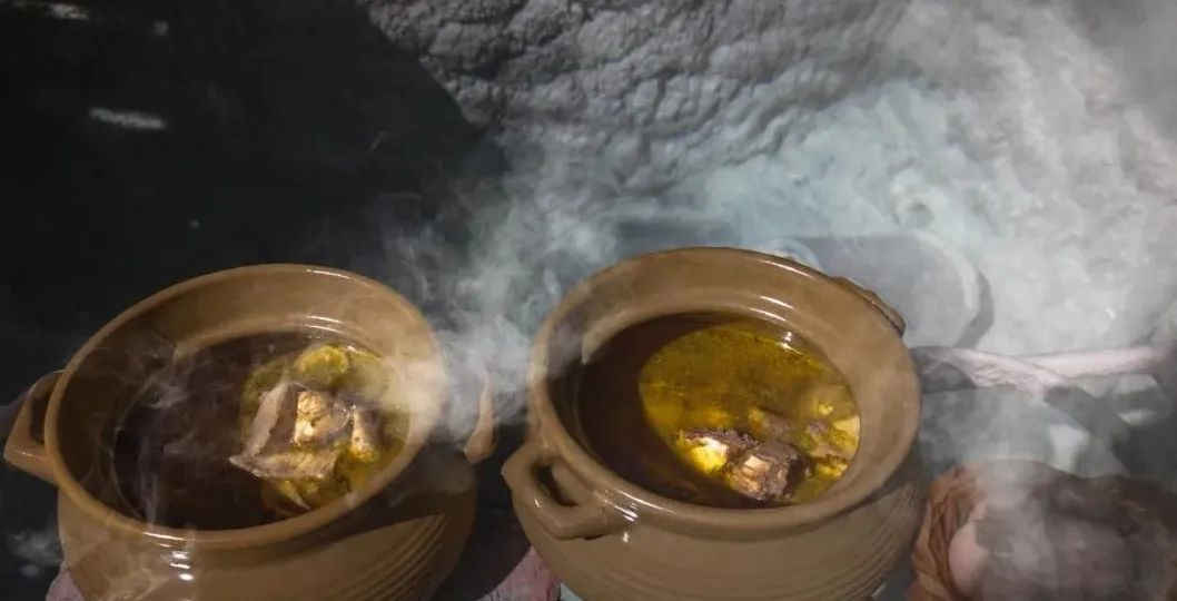 洱源山水秀美,溫泉星羅棋布,有著“溫泉之鄉(xiāng)”的美譽,這里的溫泉燉雞堪稱一絕。在制作溫泉燉雞的過程中,將雞清洗干凈后,配以鮮豬油、草果、木瓜絲、姜絲等佐料,放入陶罐中,不盛水并密封罐口,再放入硫磺泉中燉煮。隨后從泉水中取出的溫泉燉雞骨肉分離、肉質鮮美、香味撲鼻,若加上三七、蟲草、天麻等名貴藥材燉煮,更是一道難得的滋補佳肴。