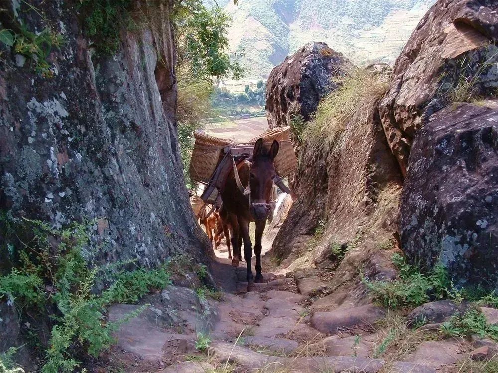 北方的四條石板路蜿蜒向遠(yuǎn)方的群山,這是古代的鹽馬古道。那些曾經(jīng)絡(luò)繹不絕的馬幫,穿越山川,留下了這片土地上的歷史痕跡。石板路上馬蹄的痕跡清晰可見,仿佛是千年前馬蹄的回響。馬幫帶來(lái)的物資與這片土地的鹽餅子交換,鹽井、鹽道與馬幫交織在一起,構(gòu)成了一條經(jīng)濟(jì)的血脈。