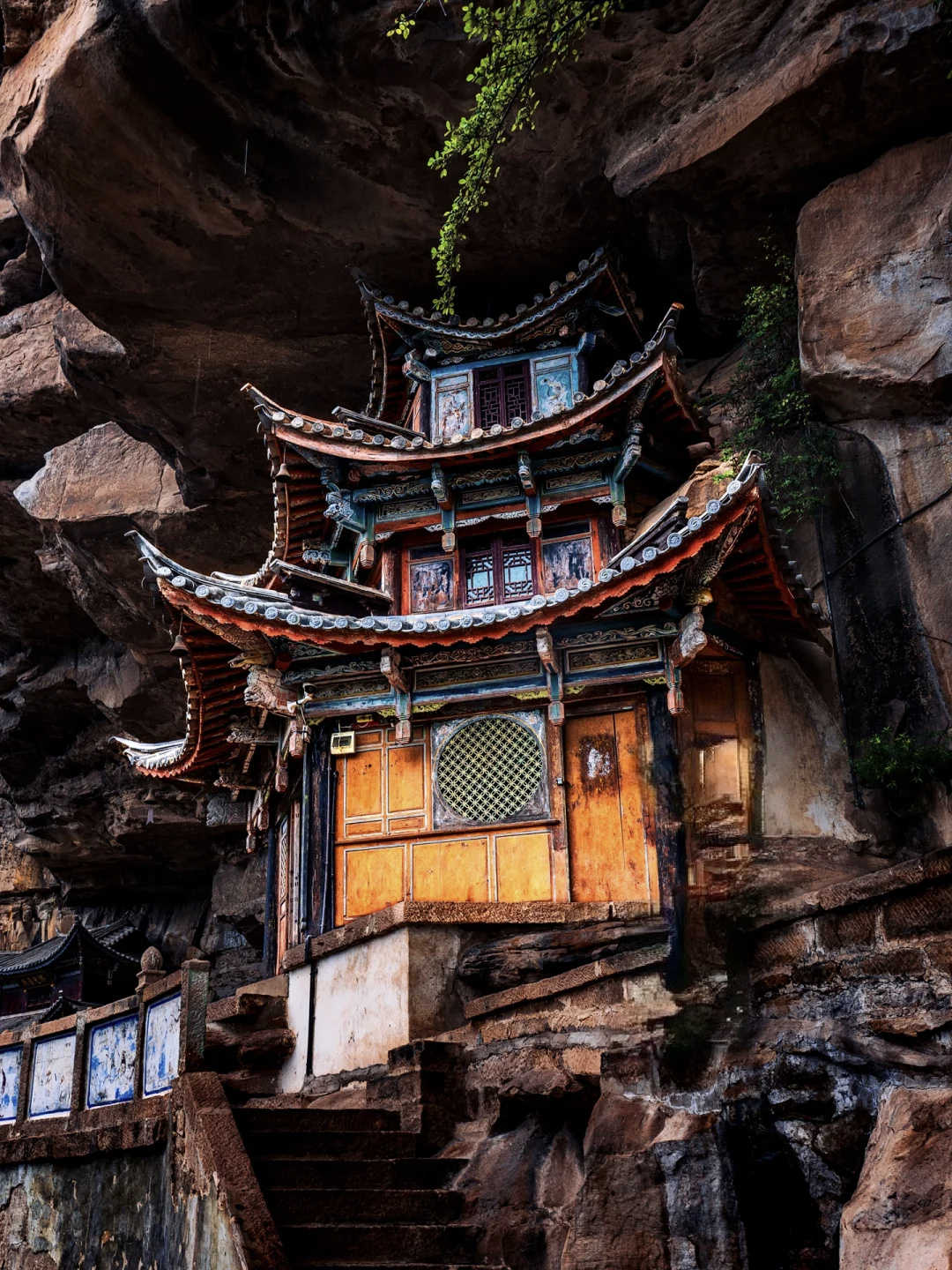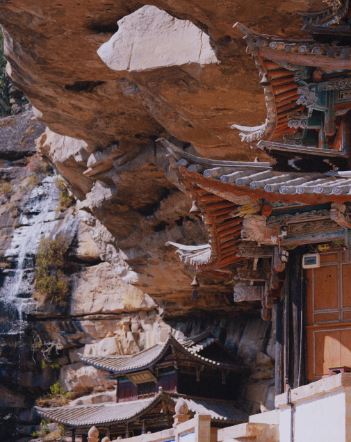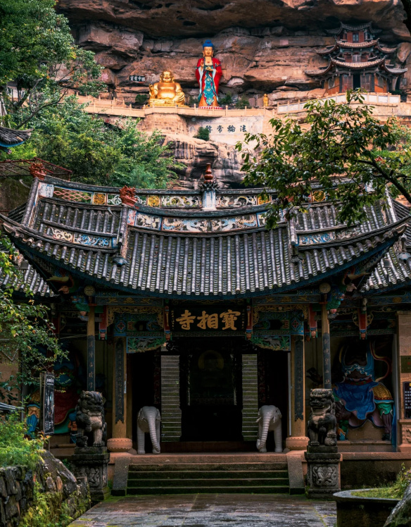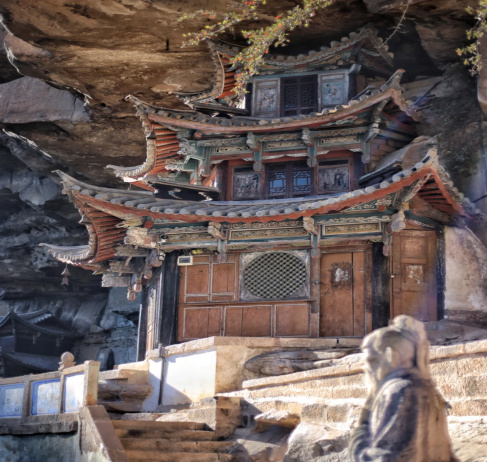 寶相寺,建在險峻的懸崖上,被稱為“云南的懸空寺”,為明正統(tǒng)年間鶴慶土知府高論所建,初為道觀后來佛教興盛,除玉皇閣外大多廟宇均祭佛像,成為一個佛道合流的場所。