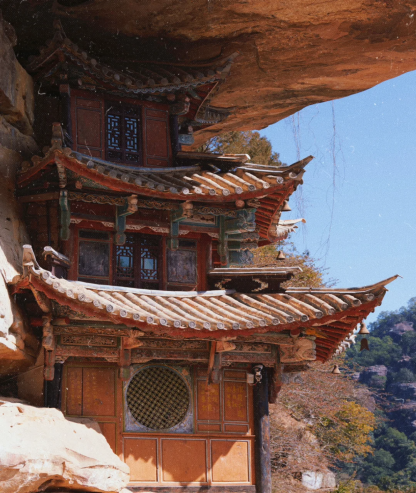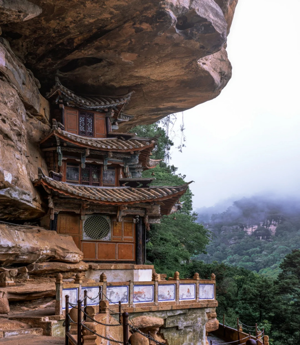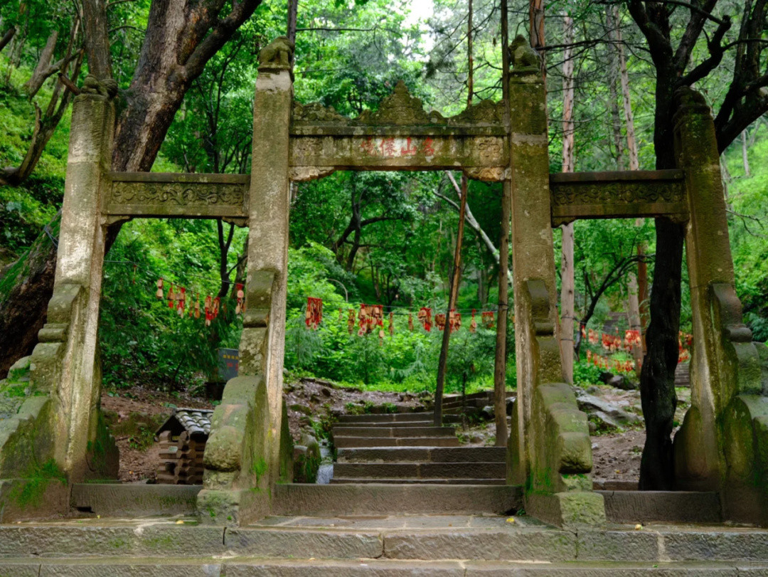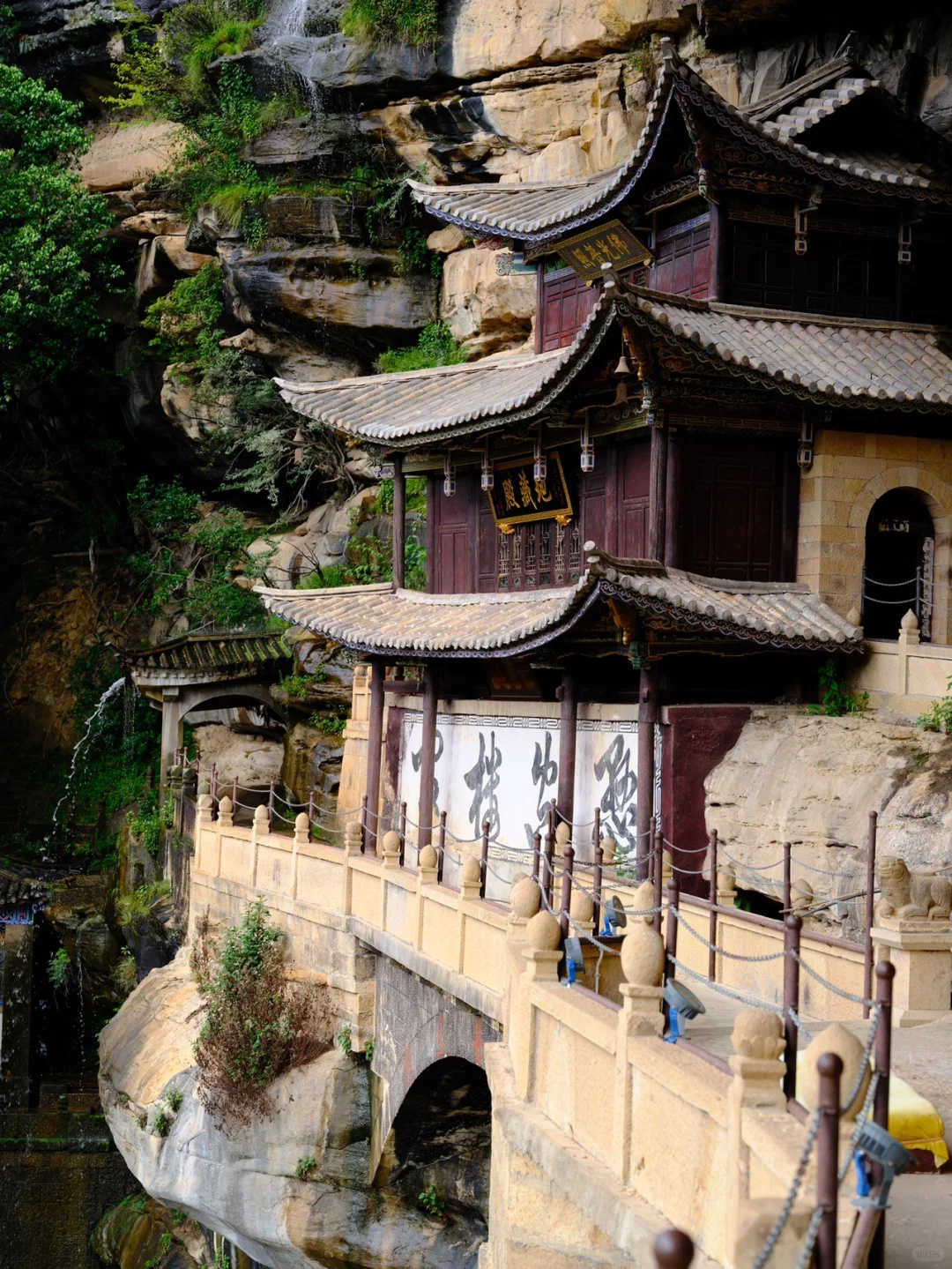山崖間有瀑布飛下,好似白色水簾一般。古人人性化地在瀑布崖壁上建造了有頂?shù)拈L廊,在長廊里透過“水簾洞”俯瞰寶相寺,整個寺廟更似人間仙境。