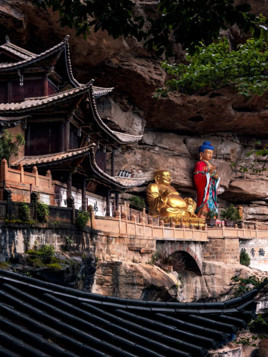 穿過小小的山門,寶相寺終于出現(xiàn),高聳著寬闊的山崖,寺廟依山勢層層抬高,貼著山崖的各個殿宇、造像在空中嵌入崖壁,這便是寶相寺最吸引人的懸空奇景。殿宇之間彌勒、如來兩尊巨大的造像屹立著,氣勢雄偉。