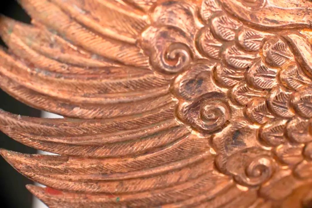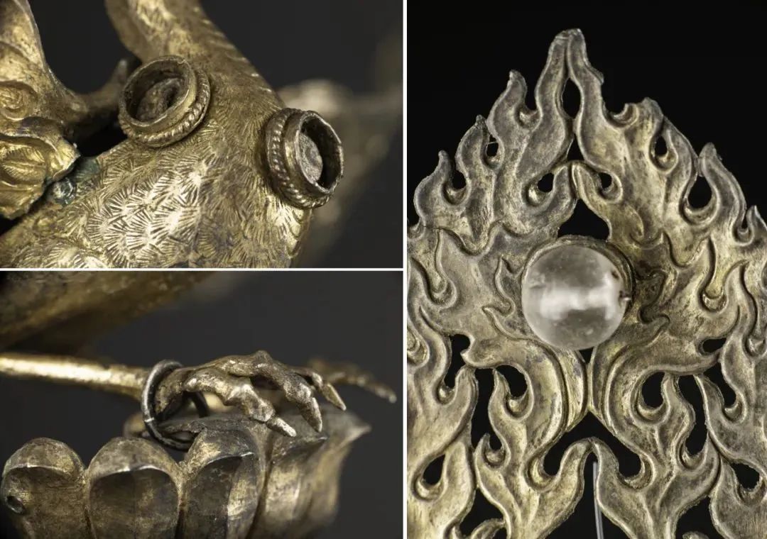 金翅鳥頭戴羽冠,身后有火焰形背光,鑲嵌了五顆水晶珠,雙翅張開并向內卷仿佛展翅欲飛。兩只鋒利的爪子抓在蓮座上,雄健而兇猛。這復雜而精美的制作工藝,不僅體現(xiàn)了工匠的高超技藝,也將金翅鳥這一神秘形象完美地呈現(xiàn)在人們面前。