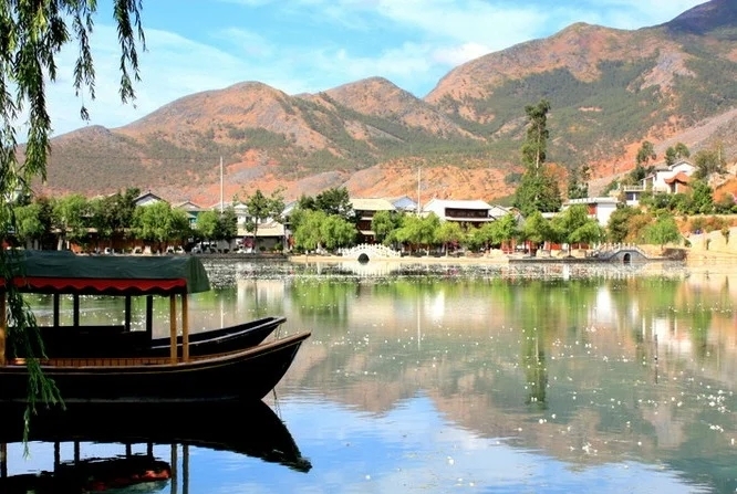 茈碧湖又名寧湖,因湖內(nèi)生長茈碧花而得名。湖中因產(chǎn)茈碧花,湖因此取名茈碧湖。茈碧花是湖中的特產(chǎn),必睡蓮科水生植物。葉呈心臟形,浮于水面,莖長七八尺,扎在水底泥中,夏季開花,類似蓮蓬,多為黃白色,每天中午12時(shí)至下午4時(shí)開放,其余時(shí)間閉合為花蕾狀,清香撲鼻。