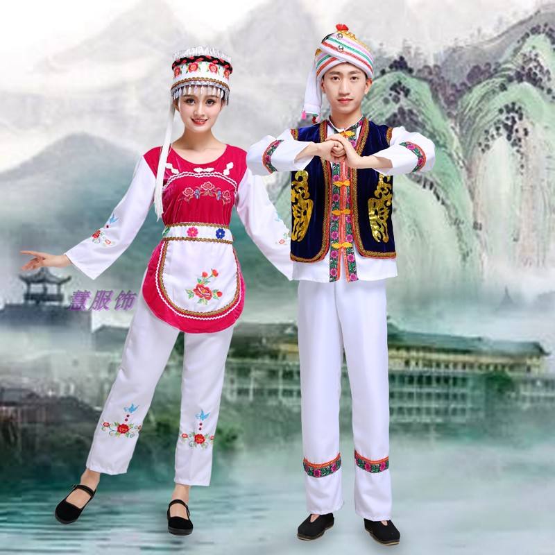 大理一帶多用繡花布或彩色毛巾纏頭,穿白上衣,紅坎肩,或是淺藍色上衣、外套黑絲絨領(lǐng)褂,右襯結(jié)紐處掛“三須”、“五須”銀飾,腰系繡花短圍腰,下穿藍色寬褲,足蹬繡花鞋。