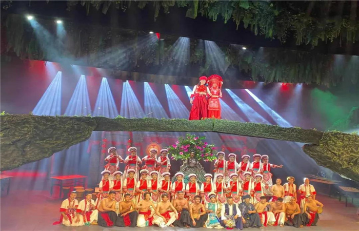 《阿鵬找金花》是楊麗萍總編導(dǎo)的第十部大型舞臺劇,圍繞大理白族文化而創(chuàng)作,具有濃郁的少數(shù)民族風(fēng)情。整個(gè)劇目講述了白族年輕男女的愛恨糾葛中,白族青年男女之間質(zhì)樸純真的愛情和白族勞動(dòng)人民的勤勞智慧被淋漓盡致地呈現(xiàn)在舞臺上。
