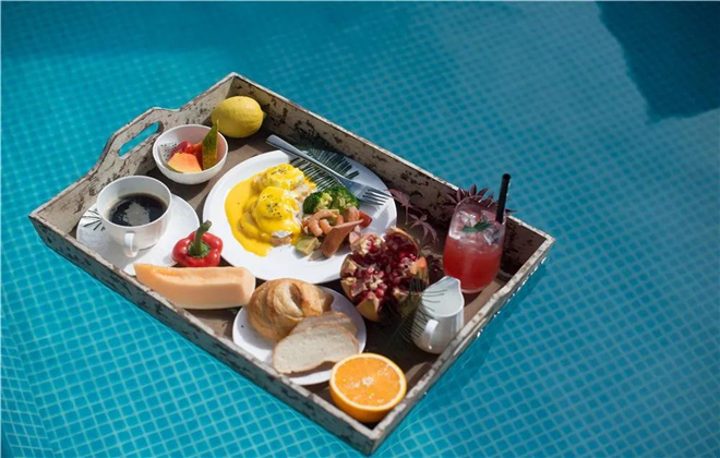 酒店院落的中央是一個透明懸挑式無邊泳池,在暖暖陽光的午后,享用一份漂浮下午茶,妥妥穿越至巴厘島度假的既視感。