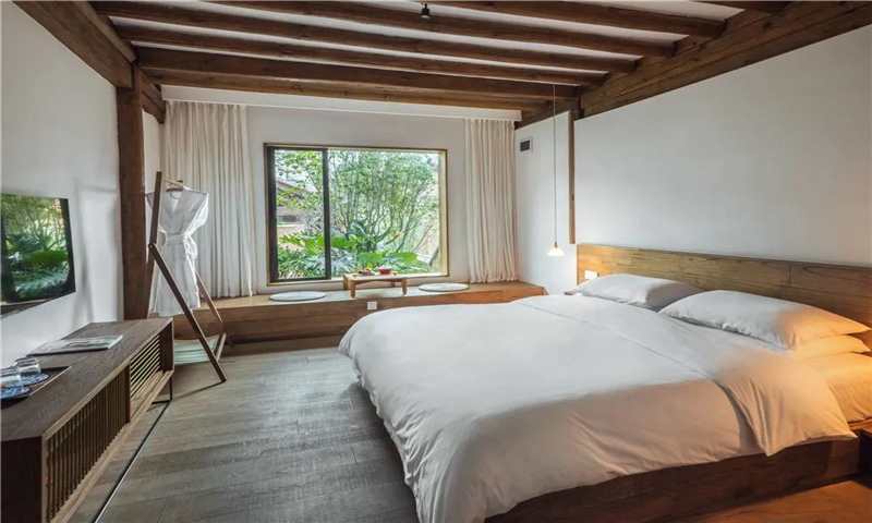 以簡(jiǎn)約風(fēng)格為基調(diào),酒店共有21間客房,以閑舍、安舍、謐舍、野舍、趣舍、云舍等命名,房間內(nèi)擺放不少精致手作物件。