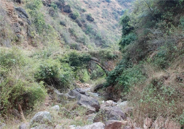 白崖古道自東而西,從今祥云云南驛經(jīng)彌渡新發(fā)村金殿窩(又名鋪山),雞鳴村達(dá)白崖古城,往西經(jīng)化城,橋頭哨,一條古老的驛道便呈現(xiàn)眼前。古道寬三、五米,皆由大小青石相砌,千百年來,風(fēng)吹雨淋,人踏馬踐,留下了無數(shù)深深淺淺的履痕蹄跡。路旁雜木叢生,百草豐茂,一澗山水淙淙南流,唱著千年古道挽歌??芍^“人稀地僻境幽幽,鴻澤無聲一水流”。沿著曲曲折折的驛道由南而北,幾經(jīng)峰回路轉(zhuǎn),一橋長(zhǎng)虹臥波,橫跨南北,這便是著名的天馬關(guān)橋。