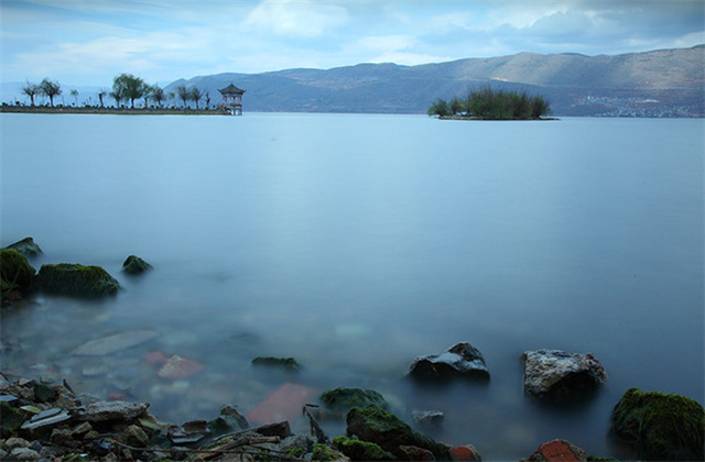 洱海月濕地公園最美的地方就是長滿水草的走廊,還有洱海邊上的石頭灘,在那里拍風景特別好看。