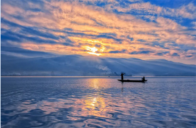 “水色清澄,漁帆點點,菰蒲掩映,頗似杭州西湖,為邊地勝景?!?劍湖形似“大元寶”,堪稱鑲嵌于滇西北高原上的璀璨明珠。初秋,湖面碧波蕩漾,水鳥嬉戲,一派勃勃生機,偶有悠揚漁歌久久回蕩。