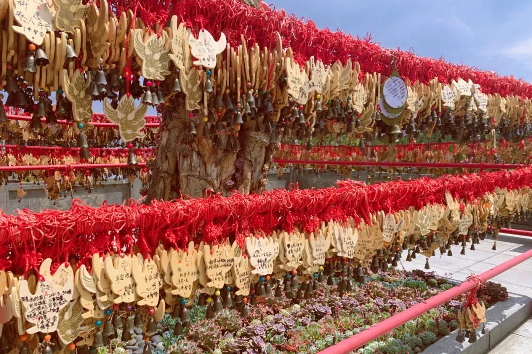 在大雄寶殿前,是許愿處,大家把心愿寫在木牌上,掛在殿前,風吹的時候,叮當作響,仿佛把大家的心愿傳達上天,希望菩薩保佑,心愿得償。