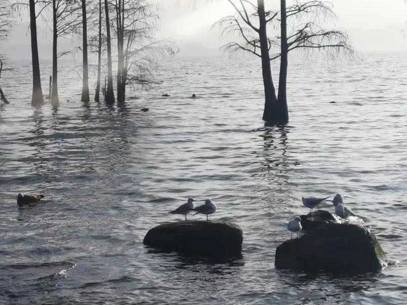 而在海心亭,一邊欣賞蒼山雪,一邊看海鷗,是一件愜意事,當(dāng)海鷗停落在海岸線,海鷗就成了水天的分隔符。