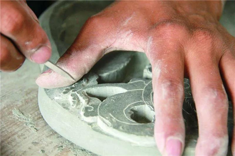 精細(xì)的雕刻與打磨過程最考驗(yàn)制硯人的工藝,也需要耗費(fèi)大量的時(shí)間,要經(jīng)歷“粗雕——粗打磨——細(xì)雕——細(xì)打磨”4個(gè)工序?!耙坏稖?zhǔn)、二刀狠、三刀平、四刀細(xì)”是雕刻的口訣?!耙庵赶碌兑珳?zhǔn),去除冗余石材,力道不能過輕或者過重,刀工要細(xì)膩精致?!睆堒S堂介紹,為追求造型和線條的流暢,一方普通大小的硯臺(tái)需要用砂紙細(xì)致地打磨半天,但這還不是最難的。“最難的是微雕,要求把硯臺(tái)上最微小的細(xì)節(jié)處理完美,例如人物的眉毛、胡須、衣紋,務(wù)求生動(dòng)細(xì)膩?!?br />