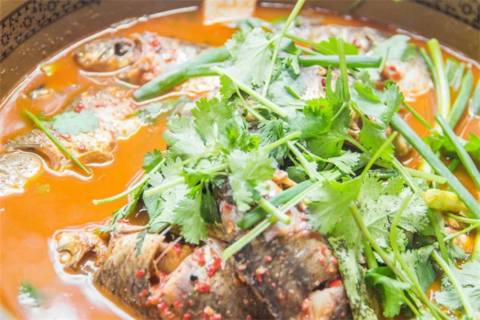 以洱海鯽魚為主材,大理酸辣魚搭配紅椒、青椒、木瓜、楊梅或?yàn)趺窞樵希垢?、土豆為輔料,用土灶燒柴火煮成。嘗上一口,鮮甜甘美,鮮香的魚湯用來泡飯也是一絕。