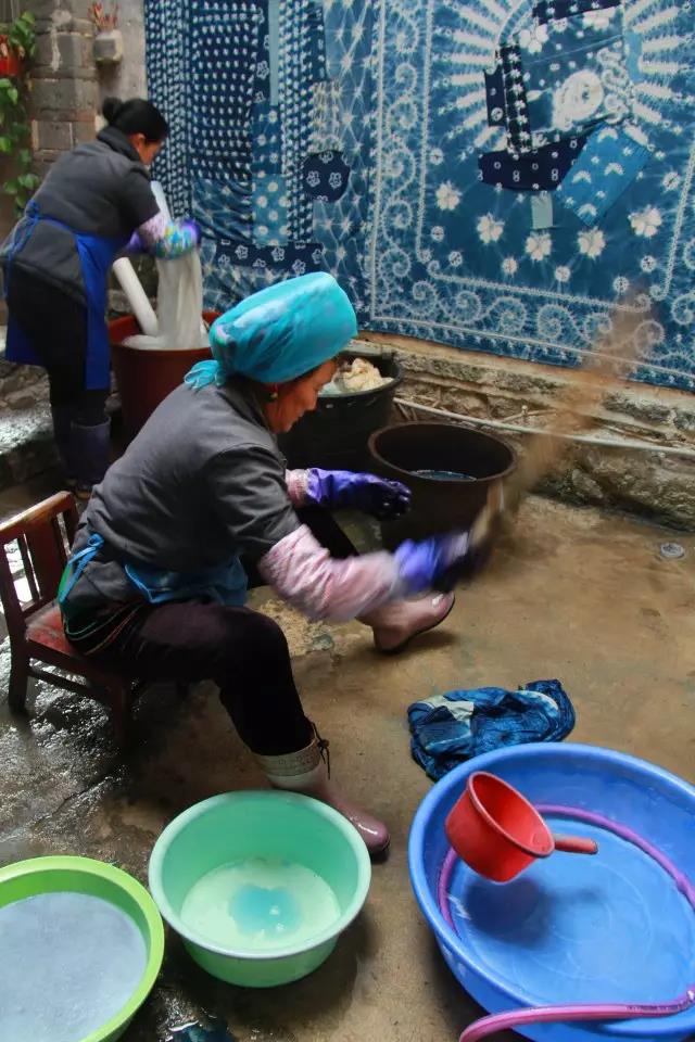 為了得到最好的染料,小白請來村里手藝精湛的老藝人進行技術(shù)指導(dǎo)。她和同事在反復(fù)的試驗中掌握了竅門?!袄?,染料在染色前加入白糖、米酒和草木灰等,染出的藍色才有自然的厚重感。”小白說。