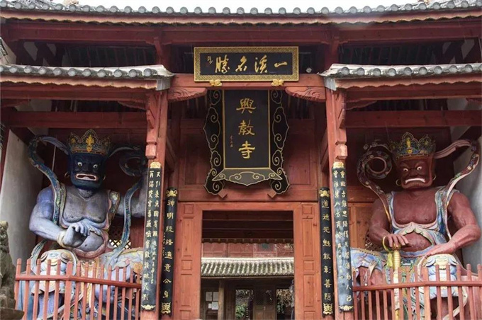 古寺叫興教寺,建于明永樂十三年(1415年),是國內僅存的白族阿吒力教(佛教直接從印度傳入大理后形成的流派,區(qū)別于漢傳佛教和藏傳佛教)寺院。阿吒力教崇拜阿嵯耶觀音和大黑天神,僧人可以娶妻,亦可參政議政。氣勢軒昂的殿宇內外,明代佛教壁畫雖然蒙塵,但是綺麗依舊。