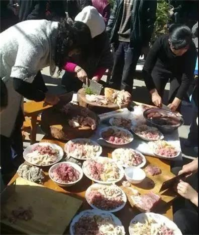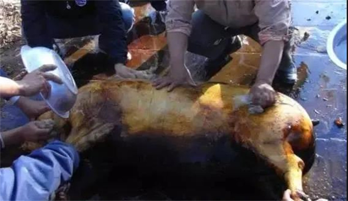 一頭豬被殺翻了,先用稻草點火,將其全身的皮子燒透,去毛,刮洗干凈。用稻草燒烤過后,整頭豬呈金黃色,皮子及其以下兩三寸的部位,實際上已經(jīng)被稻草烤熟了。然后開肚解剖,趁新鮮將火燒豬肉的“不見天部分(肚底肉、后腿肉)”、豬嘴、豬肝分切成薄片或絲狀食用。
